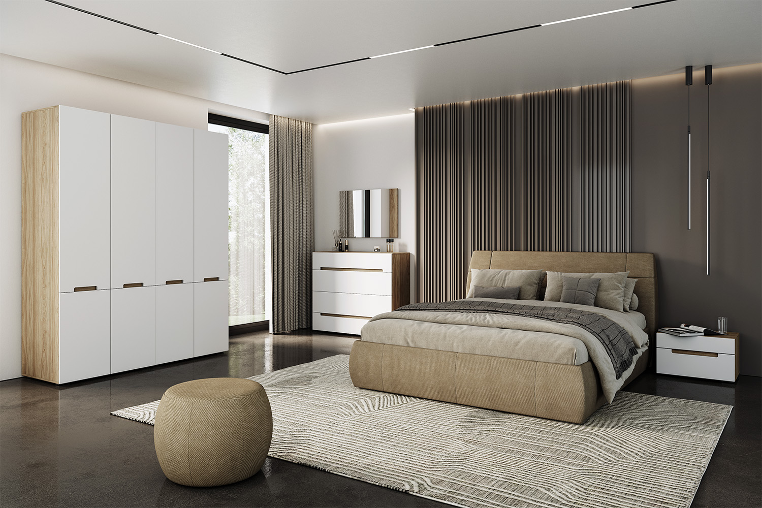 - Двустворчатый шкаф укомплектован полкой и штангой для одежды;