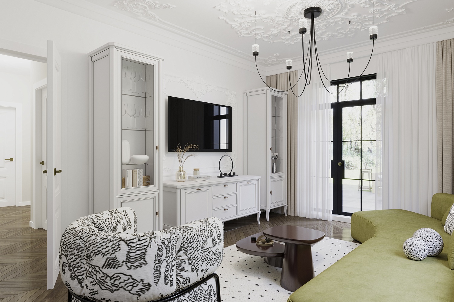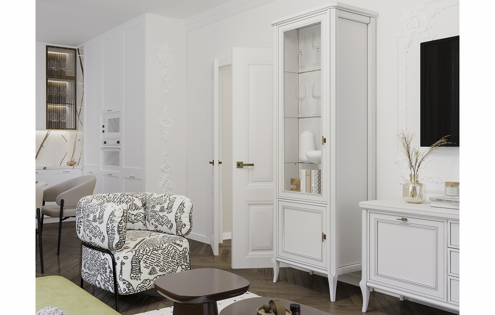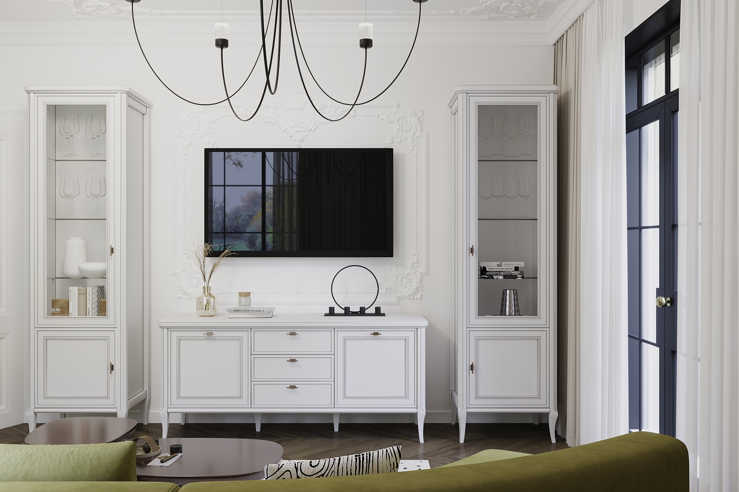 – описание: назначение для гостиной, стиль неоклассика, цвет бело-серый, размер 214.8x287x50.5 см.
