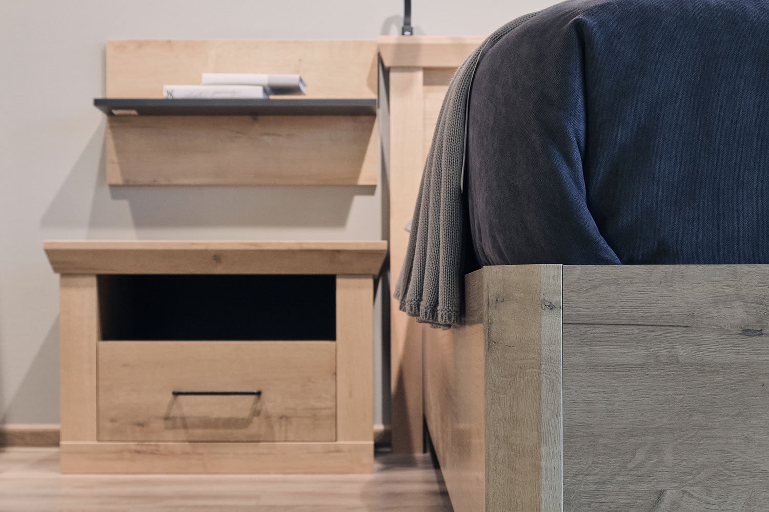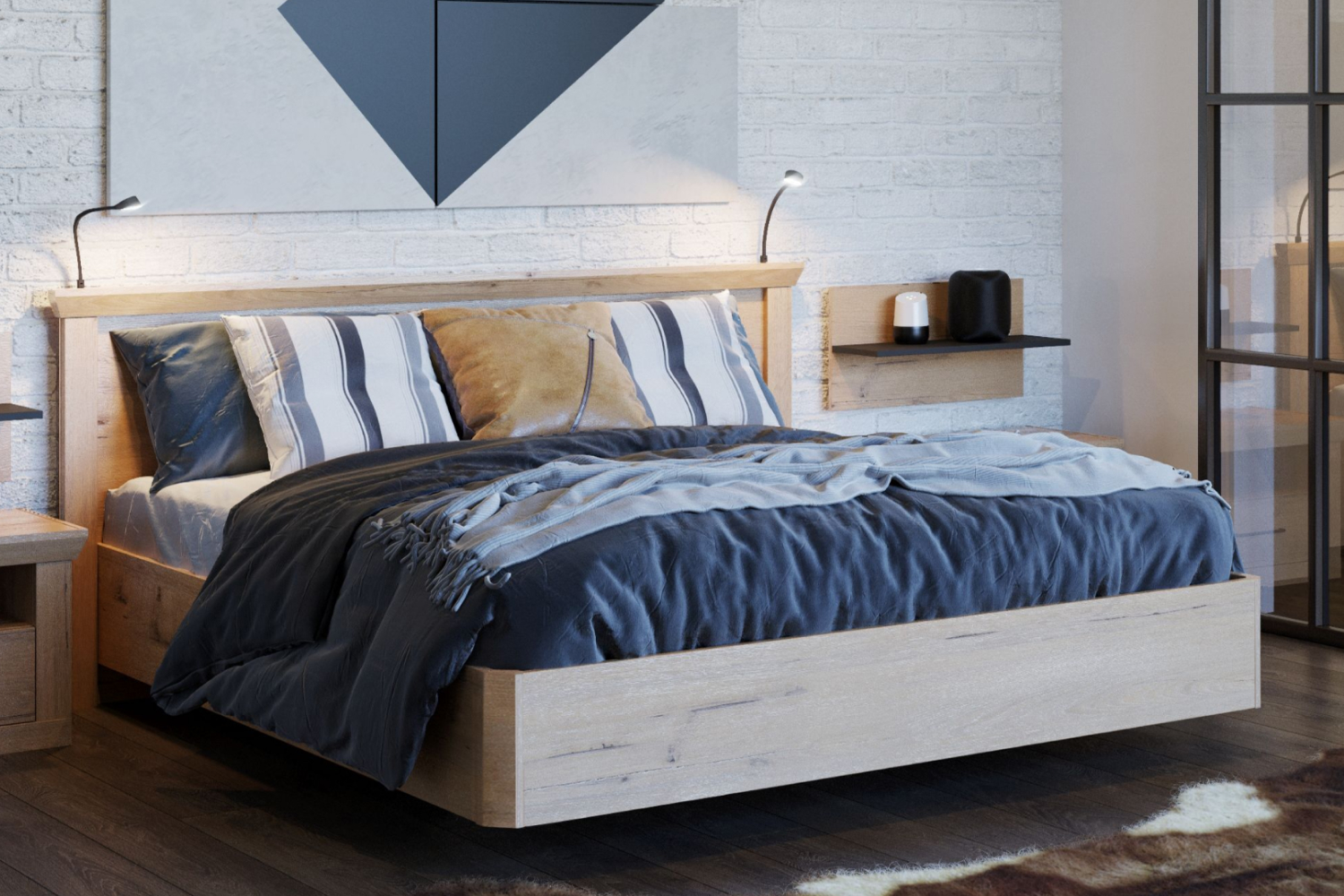 Сдержанное колористическое решение коллекции отлично сочетается с любой облицовкой стен и напольным покрытием. Спальня идеально подходит тем, кто ценит современные тенденции и обладает хорошим вкусом. Рамочные конструкции, древесные текстуры, минималистичная фурнитура универсальны и великолепно впишутся в интерьер лофт, фьюжн, эко, сканди. Все ручки окрашены в стильный черный оттенок «античное железо».