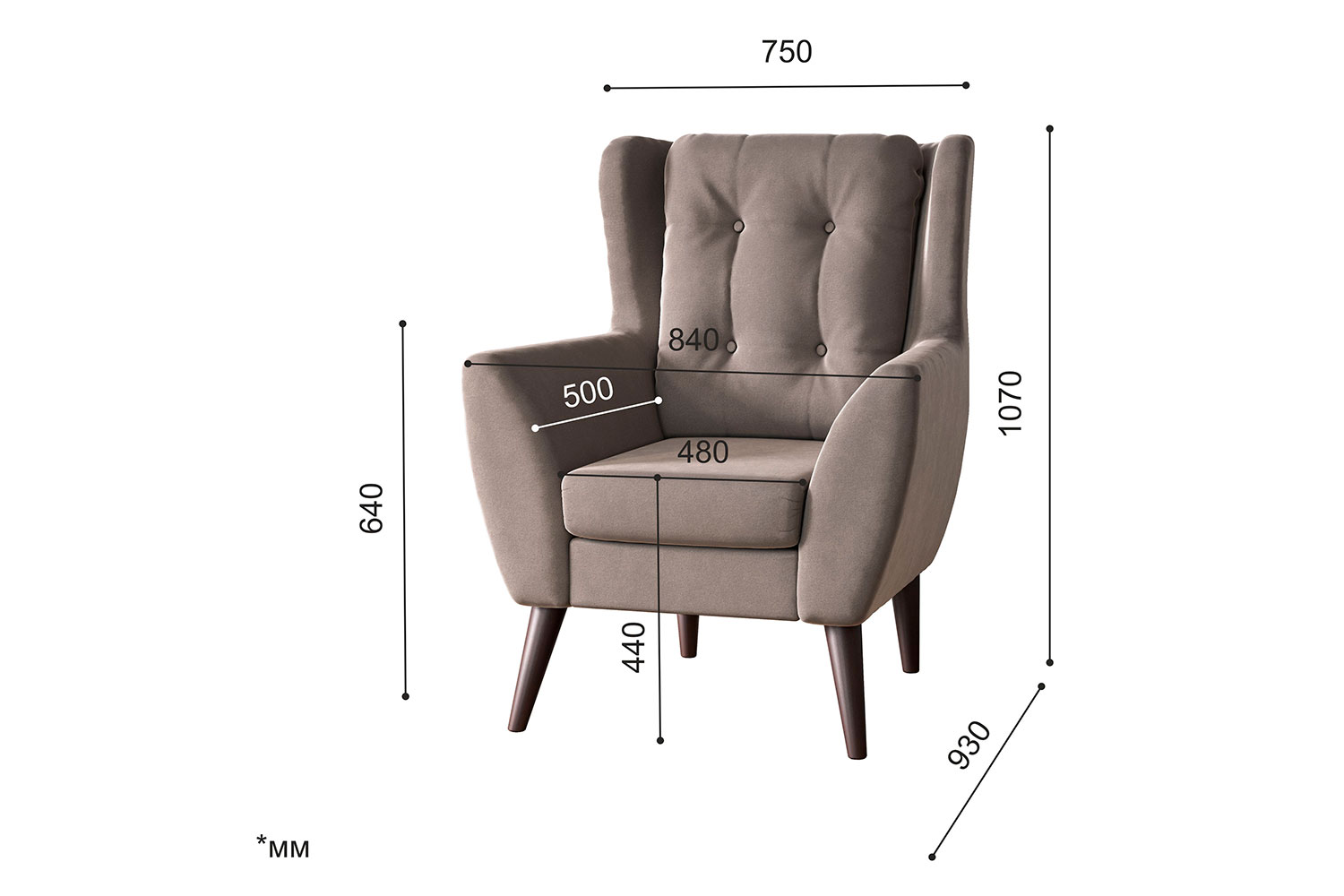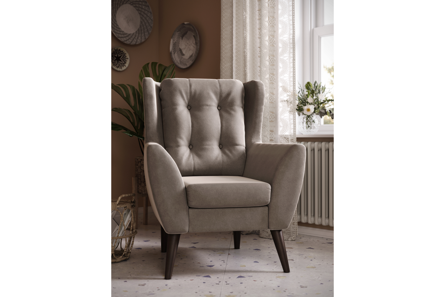 Модель с ушами, прообразом для которой послужило вольтеровское кресло, подойдет для оформления рабочего кабинета, гостиной или домашней библиотеки в стиле сканди, лофт или классика. Колоритные боковые выступы спинки символизируют уют и комфорт. Каретная стяжка и бархатистый мебельный велюр с матовой фактурой завершают традиционный английский дизайн. Изящные, утонченные ножки в цвете венге гарантируют устойчивость конструкции и словно приглашают усаживаться поудобнее.
