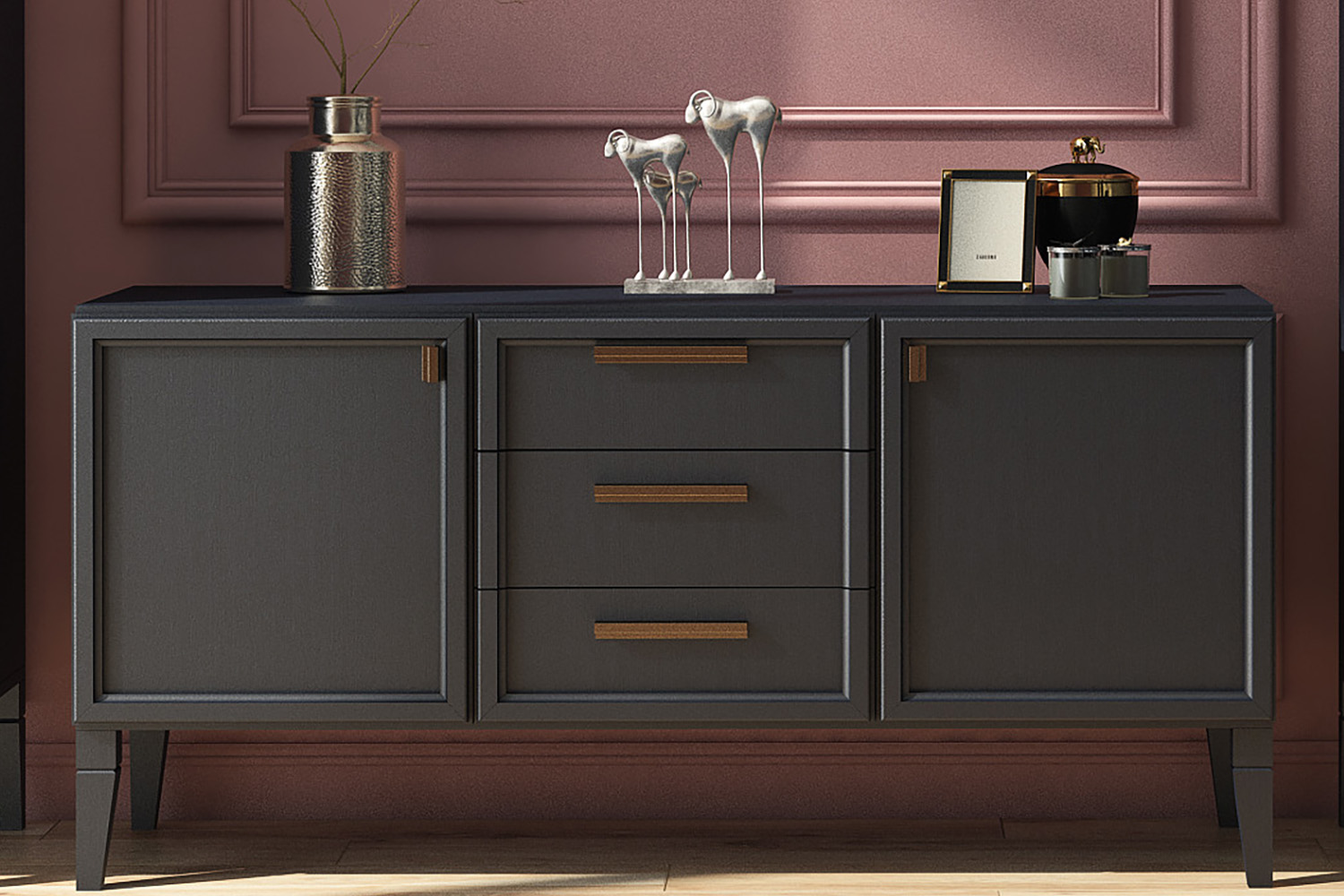 • Тумба с тремя ящиками и двумя дверцами — имеет два отделения со шпонированной внутренней полкой за двумя распашными дверцами;