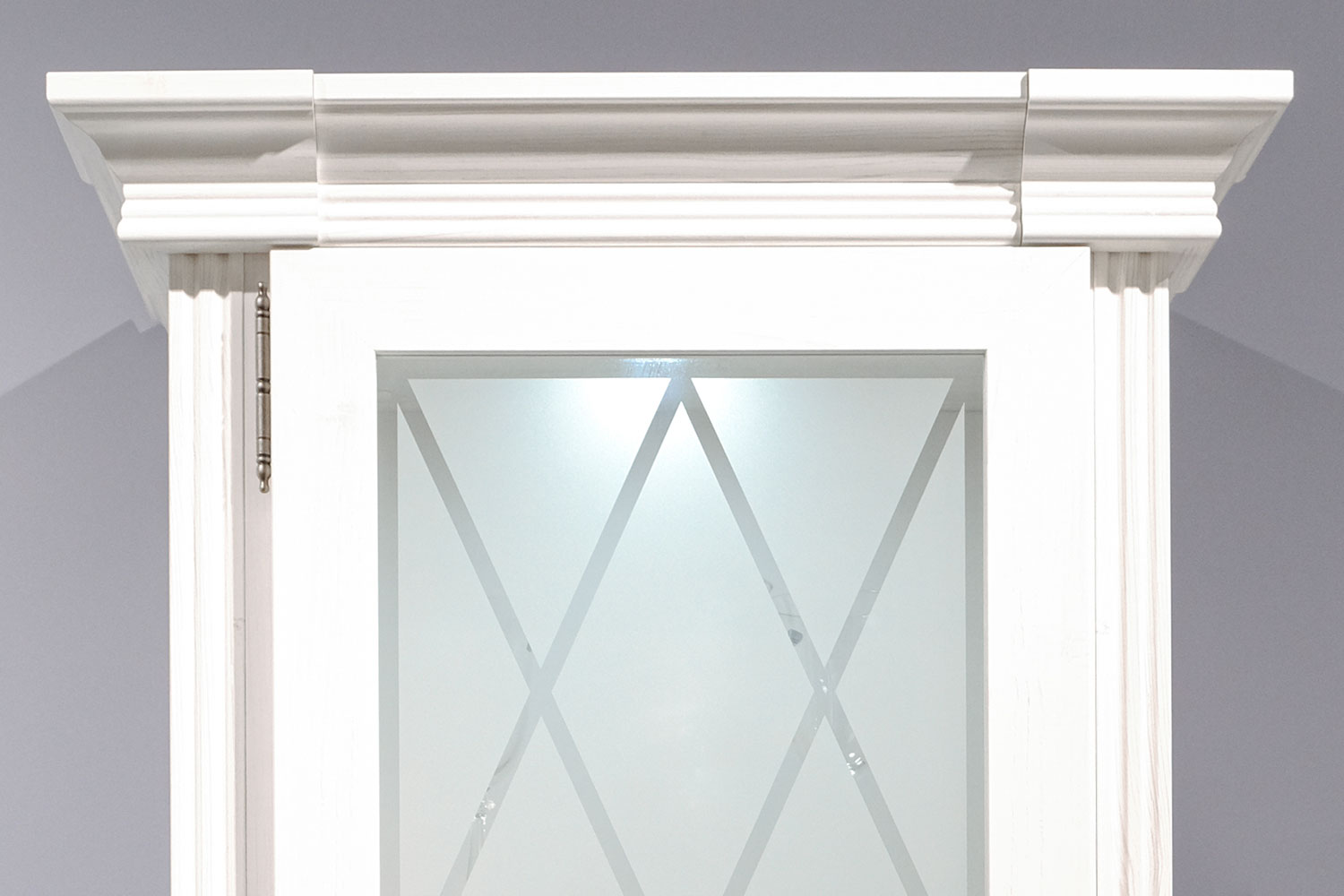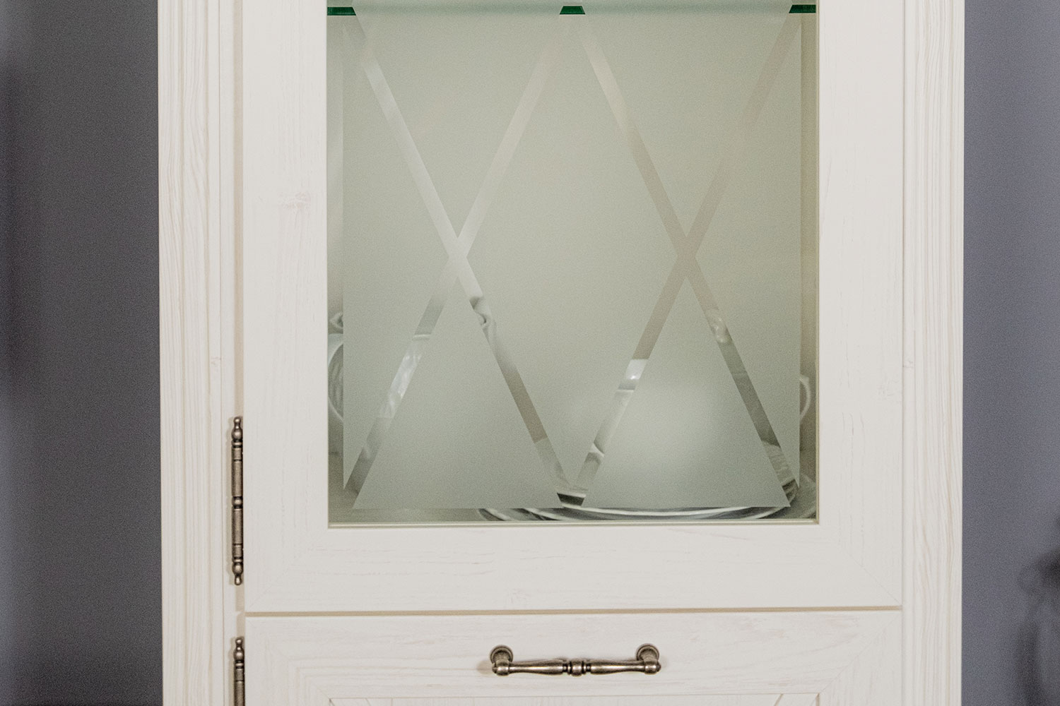Рамочные фасады, изготовленные из МДФ-профиля и декорированные стеклянными вставками, окрашены в ненавязчивый оттенок «блан шене». На корпусе и на стекле прослеживаются изящные перекрестия фахверков. Дверцы украшены фурнитурой в цвете «античное железо».