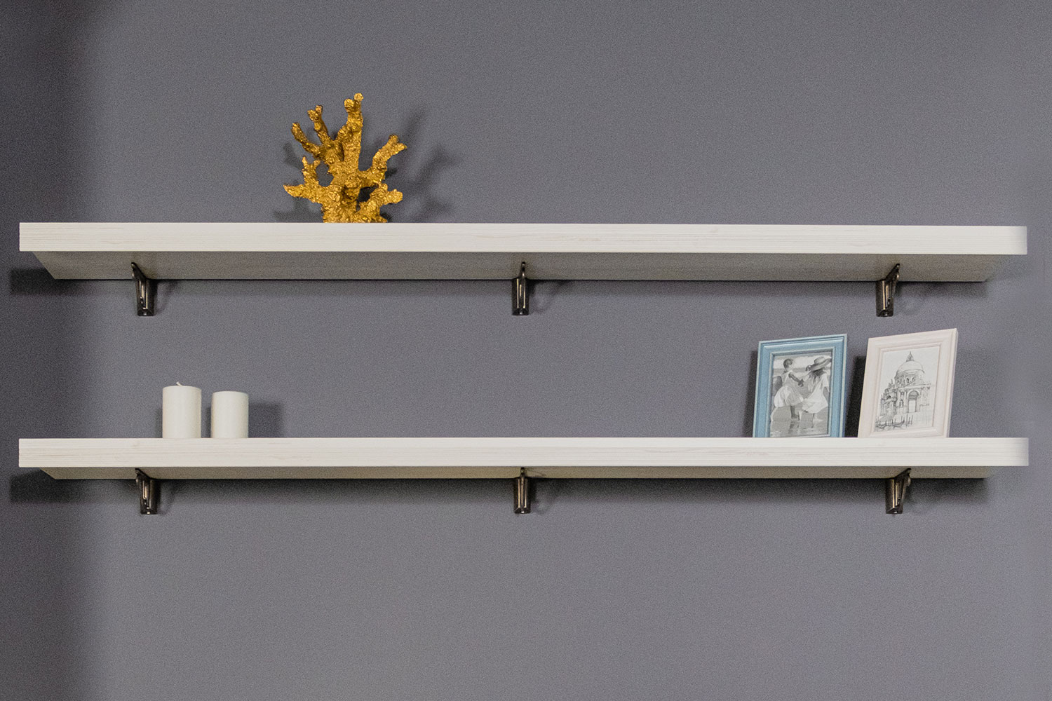 - Верхнее отделение шкафов укомплектовано тремя полками из стекла, нижнее — одной съемной полкой из ЛДСП;