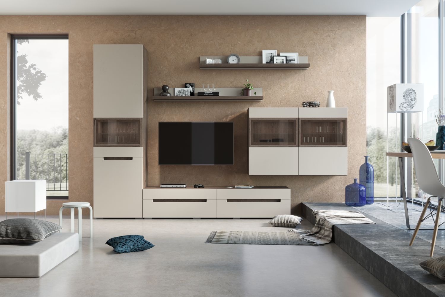 В набор входят два навесных шкафчика, две небольшие настенные полки, напольный шкаф и компактная ТВ-тумба с четырьмя выдвижными ящиками разного размера. Матовые светлые поверхности разбавлены полупрозрачными вставками, обрамленными более темным профилем. Эстетичное стекло StopSol с пиролитическим отражающим покрытием скрывает содержимое отсеков при дневном свете и подчеркивает его при включении внутренней LED-подсветки. Скрытая фурнитура делает мебель более воздушной и легкой.
